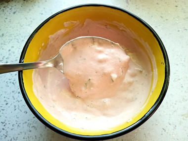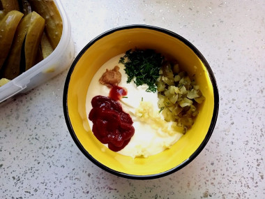 После того как все необходимые продукты подготовлены, можно приступать к непосредственной готовке самого соуса. Для этого необходимо смешать все ингредиенты между собой. Положить в миску майонез любой жирности (можно использовать домашний майонез), кетчуп и немного горчицы (берем любую по своему вкусу). Перемешать. Затем добавить измельченный чеснок и соленый огурец. Пересыпать нарезанный мелко укроп.