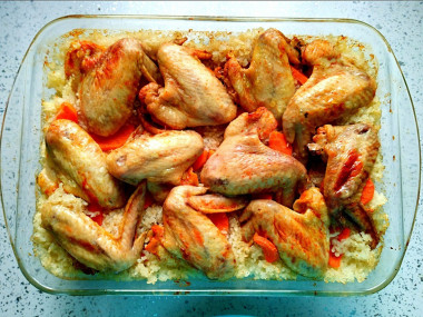 Вот уж точно, не было ни времени ни сил...а семью кормить надо) Этот рецепт Ленивая курица в духовке просто идеальный, все делает духовка, надо только минимально подготовить продукты. Курица у меня была в виде крылышек, почему то крылья у нас в семье любят. Бульон готовый тоже был, ранее варила из петуха. Рис был обычный, но я его промыла, залила холодной водой и оставила на ночь, чтобы вышел крахмал. А готовила уже на следующий день. Тут вообще все просто, выложила все слоями, залила бульоном и как и рекомендует Мария, на 1,5 часа у духовку. За это время как раз весь бульон впитался, а крылья пропеклись. потом минут 10 под грилем подержала, сильно не зарумянивала. Получилось ну очень вкусно! Особенно понравился рис, пропитанный насыщенным бульоном, он получился таким нежным, сочным, но не водянистым. А курочка в специях тоже очень аппетитная. И правда, напоминает плов с курицей) Хорошо, что есть вот такие рецепты)