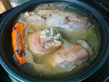 У меня был 1 кг хвостов, кусочек говядины без кости (около 300 граммов). От себя добавила еще две небольшие свиные ножки. Чаши мультиварки у меня на 2,5 л. Варила холодец на режиме «Суп» (при закрытой крышке) 1 час. Потом процедила бульон, вернула в него мясо, добавила морковь и варила холодец при открытой крышке 3,5 часа на режиме «Тушение».