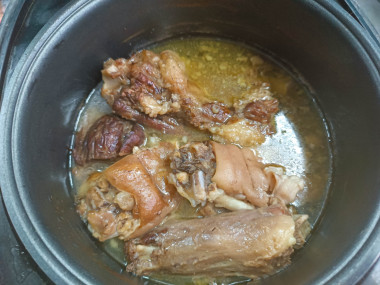 Моем чашу мультиварки от налета, образовавшегося в процессе варки мяса, заливаем бульон обратно. Включаем режим "Варка" или "Суп", оставляем крышку открытой, варим. Время можно не выставлять, в этом процессе важно не время приготовления, а результат. Количество бульона должно уменьшиться до двух чашек. Все упрощается, если есть специальный режим "Холодец" - просто включаем его при закрытой крышке.