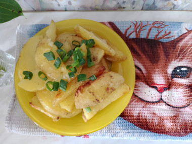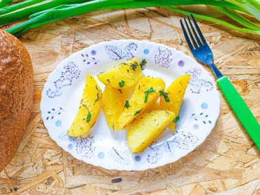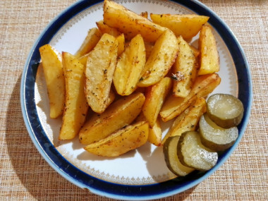 Картошечка - один из лучших, универсальных гарниров. К ужину готовила картошку в духовке без мяса. Так как она была не молодая, то я её очистила от кожуры, нарезала дольками, потом проварила три минуты в воде. Замариновала картошку в подсолнечном масле с добавлением соли, чёрного перца, паприки, сухой зелени и давленного прессом чеснока.