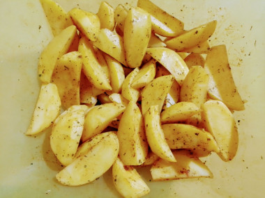 Влейте оливковое масло. Тщательно перемешайте картофель, можете это сделать руками, чтобы все ломтики были покрыты маринадом. Оставьте картофель в нем на 20 минут.