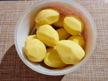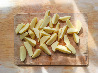 Картофель помойте. Блюдо получится особенно вкусным, если использовать для его приготовления молодой картофель и запекать его в кожуре. Но если картофель старый, то его лучше очистить. Мытые картофелины разрежьте на ломтики, напоминающие своим внешним видом дольки апельсина. Промойте их от крахмала, удобнее это сделать, сложив картошку в дуршлаг. Затем дайте воде стечь.