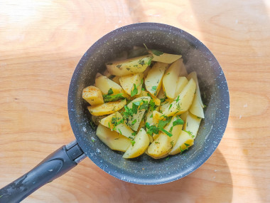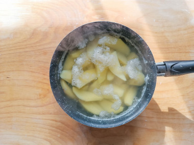 В кастрюлю или иную металлическую посуду налейте воду, поставьте ее на огонь. Когда вода закипит, опустите дольки картофеля в кипяток. Варите их на среднем огне около 3 минут с момента закипания. Затем воду слейте, снова откинув картофель на дуршлаг и дайте воде полностью стечь. Такое предварительное отваривание сделает картофель мягче и сократит время приготовления.