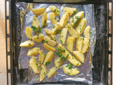 Форму для запекания или противень застелите пергаментом. Выложите замаринованный картофель на пергамент, оставляя пространство между кусочками. Духовку разогрейте до 180 градусов. Запекайте картофель около 30 минут. Он должен слегка зарумяниться. Готовность определите острым ножом — он должен легко протыкать дольку.