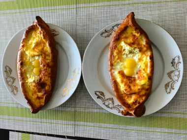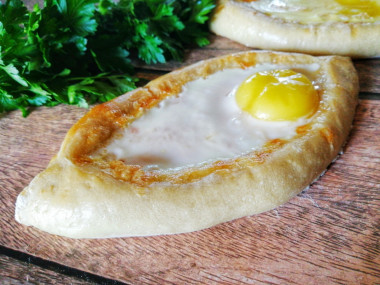 Выньте хачапури из духовки и вбейте по одному яйцу в каждую лодочку, стараясь не повредить желток. Верните хачапури в духовку ещё на 2-3 минуты. В идеале белок должен чуть пропечься, но сохранить нежную текстуру, а желток остаться жидким.