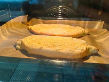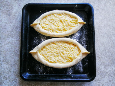 Перенесите заготовки для хачапури на высланный пергаментом противень. О том, как правильно выбрать пергаментную бумагу, читайте в отдельной статье по ссылке в конце рецепта. В каждую лодочку выложите начинку, края теста смажьте желтком. Выпекайте хачапури около 25 минут. Точное время зависит от вашей духовки. Подробнее об особенностях работы духовок можно прочитать в отдельной статье по ссылке в конце рецепта.