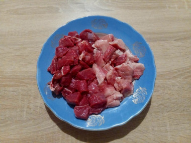 Итак, взять кусок говядины, промыть его под холодной водой и обсушить. Затем вырезать из него косточки, если таковые имеются, снять пленочки, а остальную часть нарезать на кусочки произвольной формы.