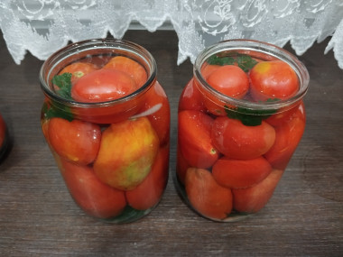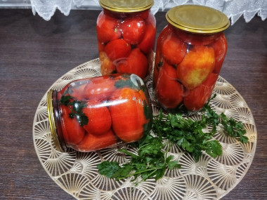 Снова залейте кипящий маринад в банки до плечиков. Сразу закатайте банки с помидорами крышками. Переверните банки вверх дном и укутайте теплым одеялом. Оставьте на ночь до полного остывания при комнатной температуре. Заготовка готова. Приятного аппетита!