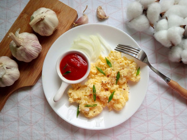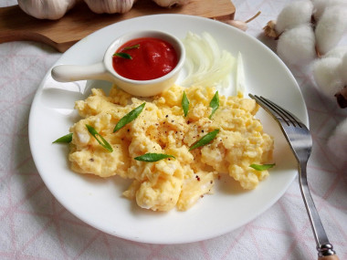 Для меня такой способ приготовления яиц самый любимый, скрамбл, или более привычная нашему слуху яичница-больтунья. Идеальный быстрый завтрак без хлопот, вкусный и питательный. Главное его не пережарить, чтобы не превратить яйца в резину. Я готовлю меньше минуты. Но все-таки добавляю сливки, так яичница получается нежнее.