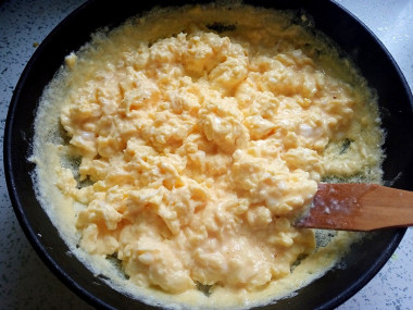 Моментально начните перемешивать яичную смесь лопаткой в разные стороны в хаотичном порядке, не давая яичному блинчику схватиться единым пластом.