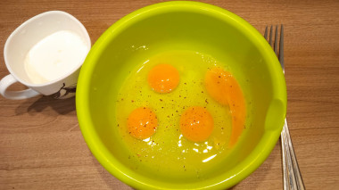 Как сделать болтунью яичницу? Подготовьте все продукты. Яйца вымойте с содой под проточной водой и вбейте в миску. Добавьте щепотку соли. Можно поперчить по вкусу. Так блюдо получится более ярким на вкус. С помощью вилки смешайте до однородности желток и белок. Добиваться сильных пузырьков болтунье совершенно не нужно, они здесь, как раз, будут лишними.
