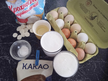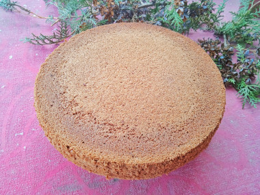 Заинтересовал рецепт отсутствием муки в выпечке. Я муку употребляю, но захотелось попробовать сделать бисквит без муки. Все продукты были в наличии, только сливки взяла жирностью 33%. Решила готовить шоколадный бисквит, поэтому добавила от себя какао порошок 2 ст.л. Готовила чётко по рецепту. Соединила крахмал картофельный, разрыхлитель и какао. Сначала соединила белый шоколад с нагретыми сливками и маслом. Отдельно взбила белки с сахаром и желтки с сахаром. Затем смешала желтки со сливками и шоколадом. Добавила сухие продукты и в конце аккуратно вмешала пышные белки. Выпекала в форме диаметром 24 см полчаса, готовность проверяла зубочисткой. Остужала на решетке, разрезала на три коржа и смазала кремом.