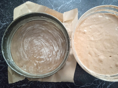 Форму для запекания диаметром 22-24 см выстилаем пергаментом, а после выливаем в форму получившееся тесто. Ставим форму в успевшую разогреться духовку на полчаса. Готовность бисквита проверяем тестом на сухую палочку. Шпажку, зубочистку или спичку втыкаем в бисквит, а потом достаем и смотрим. Если тесто не прилипло, то есть палочка осталась сухой, бисквит готов.