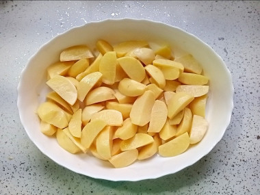 Картошку вымойте, очистите и нарежьте средним кубиком. Если у вас молодой картофель небольшого размера, можно его не чистить, а тщательно вымыть щеткой. В этом случае клубни проткните вилкой и запеките целиком.