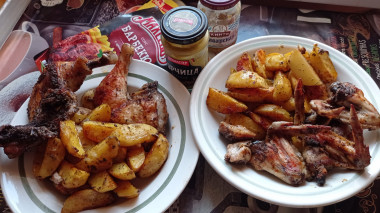 На день рождения в качестве основного блюда приготовила куриные бедрышки с картошкой. Очень удобно запекать сразу и мясо и гарнир.