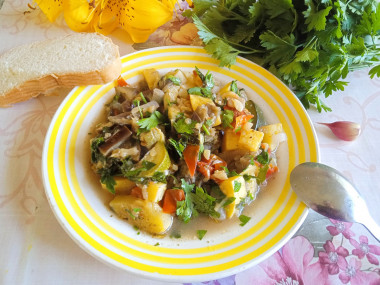 Захотелось приготовить рагу, понравился мне этот рецепт. Без заморочек, всё предельно просто. Взяла свежие овощи с грядки, помыла, почистила, порезала и сложила в кастрюлю. Нет у меня такой глубокой сковороды, так как я количество продуктов увеличила в два раза. Добавила масло и воду, тушила овощи 40 минут под крышкой. В конце добавила чеснок, петрушку, соль, перец и хмели-сунели. Аромат блюда превосходный.