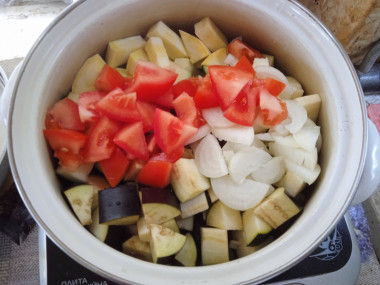 В сковороде разогрейте растительное масло. Выложите нарезанные кабачки, лук, баклажан, помидоры. Как выбрать подходящую сковороду и мало для жарки читайте в отдельных статьях в конце этого рецепта.