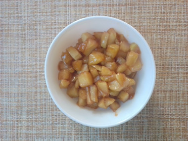Выложите яблоки в сотейник или в сковороду, добавьте сахар, корицу и ванилин по вкусу. Как заменять ванилин читайте в отдельной статье по ссылке в конце рецепта. Поставьте сотейник с яблоками на огонь, влейте немного воды. Тушите на медленном огне около 15 минут с момента закипания на среднем огне. Яблоки должны стать карамельного цвета. Переложите начинку в миску и дайте ей немного остыть.