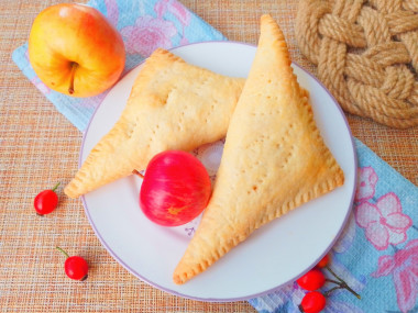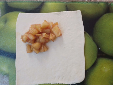 На каждый квадратик теста выложите немного яблочной начинки, скрепите концы теста так, чтобы получился треугольник.