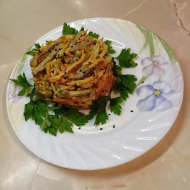 Очень вкусный салатик: насыщенный, сытный и довольно пикантный, здесь я только сметану на майонез заменила. Печень люблю и стараюсь готовить из нее разнообразные блюда. Этот салат, однозначно, еще не раз появится у нас на столе не только в будние дни, но и в праздничные)).
