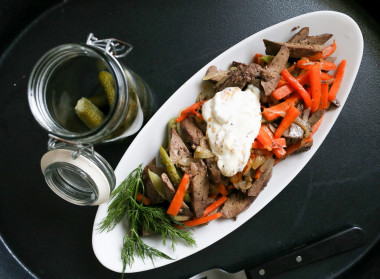 Как сделать салат с печенью и огурцами? Подготовьте все необходимые продукты для салата. Печень подойдет любая как говяжья, так и свиная, куриная. У меня была свиная печень. Так же нам понадобятся три небольшие моркови, две луковицы, два крупных маринованных огурца, майонез, сметана, французская горчица, чеснок, соль и перец.