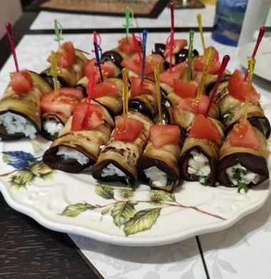 Свернутые в рулетики баклажаны с творожной начинкой украшаем кусочком помидора и скрепляем зубочисткой или шпажкой.