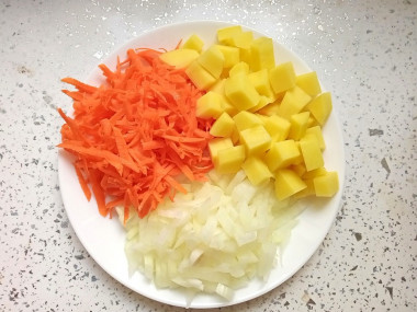 Лук и морковь очистите, промойте и измельчите. Лук нарежьте ножом на кубики, морковь натрите на крупной тёрке (или мелко нарежьте). Как только бульон закипит и появившаяся пенка будет убрана, добавьте в суп измельчённые морковь и лук. Продолжайте варить суп на среднем огне.