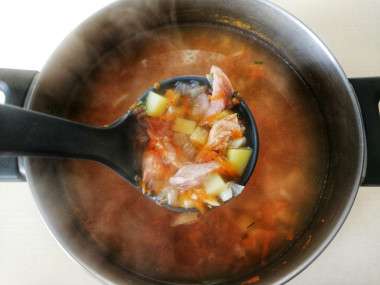 В процессе приготовления немного отошла от рецепта и сначала сделала бульон, варила рыбу минут 20. Затем переложила ее на тарелку, бульон процедила и вновь поставила на огонь, а рыбу отделила от костей и вернула в кастрюлю. Когда бульон закипел, добавила лук, морковь, картошку. Варила овощи 20 минут. Затем положила в суп промытый рис (у меня был длиннозерный пропаренный), лавровый лист и соль, перец я не добавляла. Выключила суп, когда рис стал мягкий. За минуту до этого добавила укроп - в моем случае замороженный. Суп сразу стал таким ароматным! А ещё он получился довольно густой и вкусный!