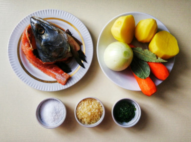 Как сварить уху из головы и хвоста горбуши? Подготовьте указанные ингредиенты. У меня вес головы и хвоста рыбы чуть больше килограмма. Рис выбирайте, какой хотите, у меня - пропаренный. Если необходимо, рыбу заранее разморозьте. Овощи и зелень вымойте и обсушите.