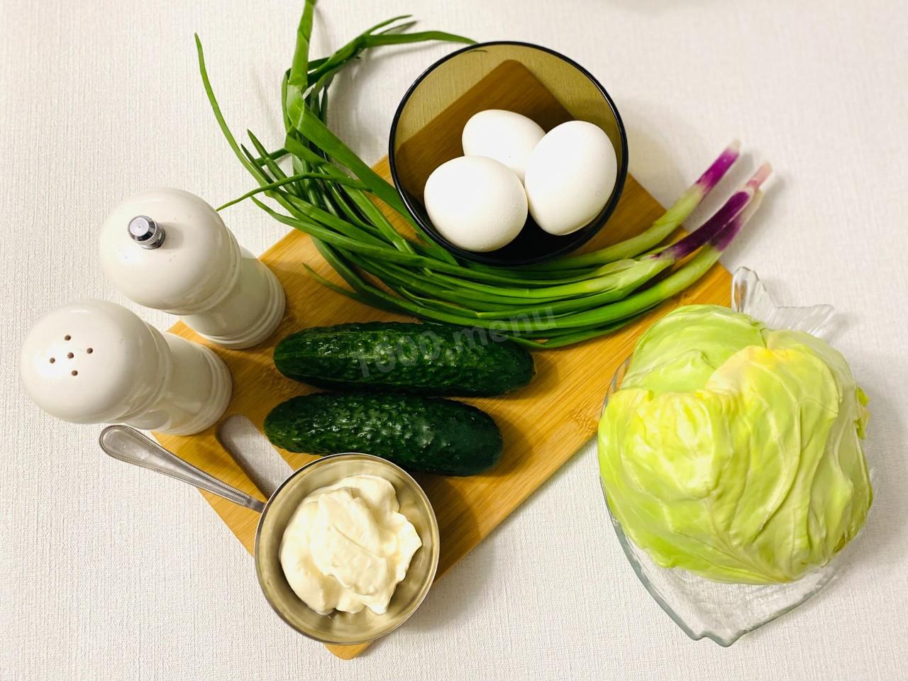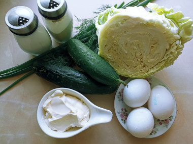 Как приготовить салат из свежей капусты с майонезом? Подготовьте все ингредиенты: зелень, огурцы и яйца помойте, с капусты удалите загрязненные и подпорченные листья. Яйца отварите вкрутую, для категории СО достаточно 10 минут, для категорий меньше, просто уменьшайте время варки на 1 - 1,5 минуты. Все о том, как выбрать и сварить яйца читайте в статье, ссылка под шагами.