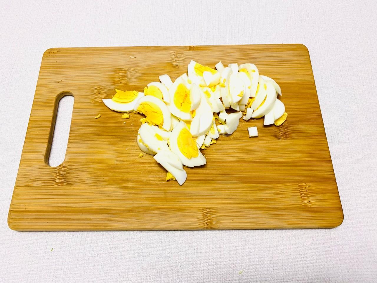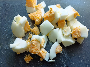 Яйцо также нарежьте брусками. А чтоб яйца лучше чистились, после окончание варки опустите их в холодную воду до полного остывания.