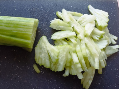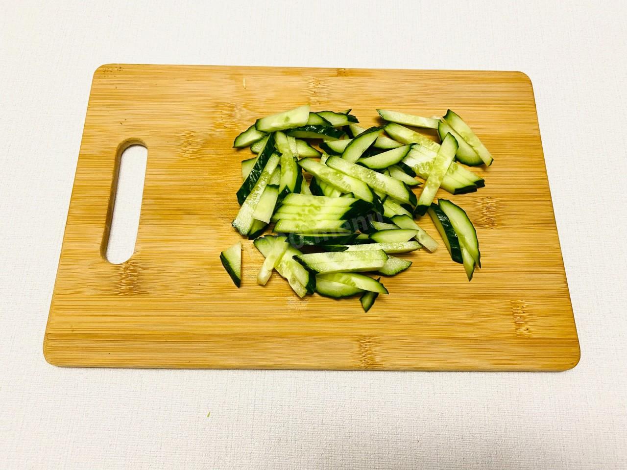 Если кожура горчит или слишком толстая, то очистите огурец, чтоб не испортить вкус салата, и нарежьте его небольшими брусками.