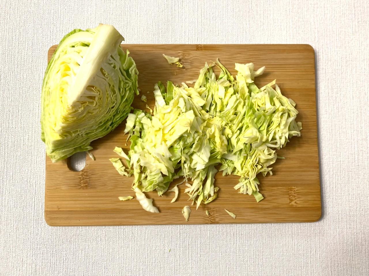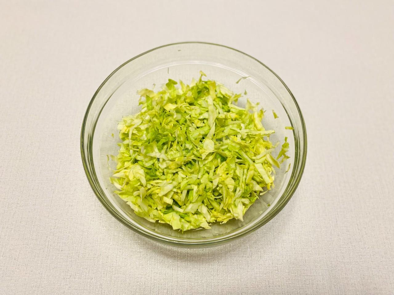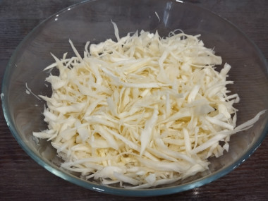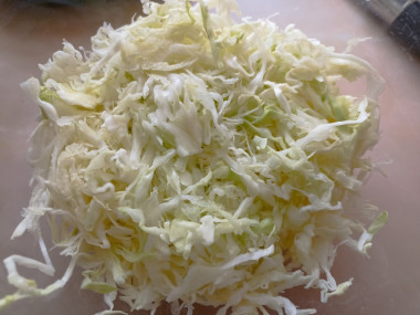 Капусту мелко нашинкуйте. Если капуста не молодая, ее можно измельчить с помощью слайсера, так она получится более тонкой, мягкой и сочной.