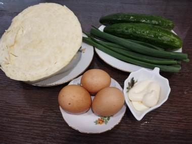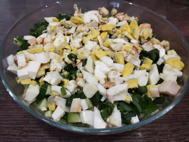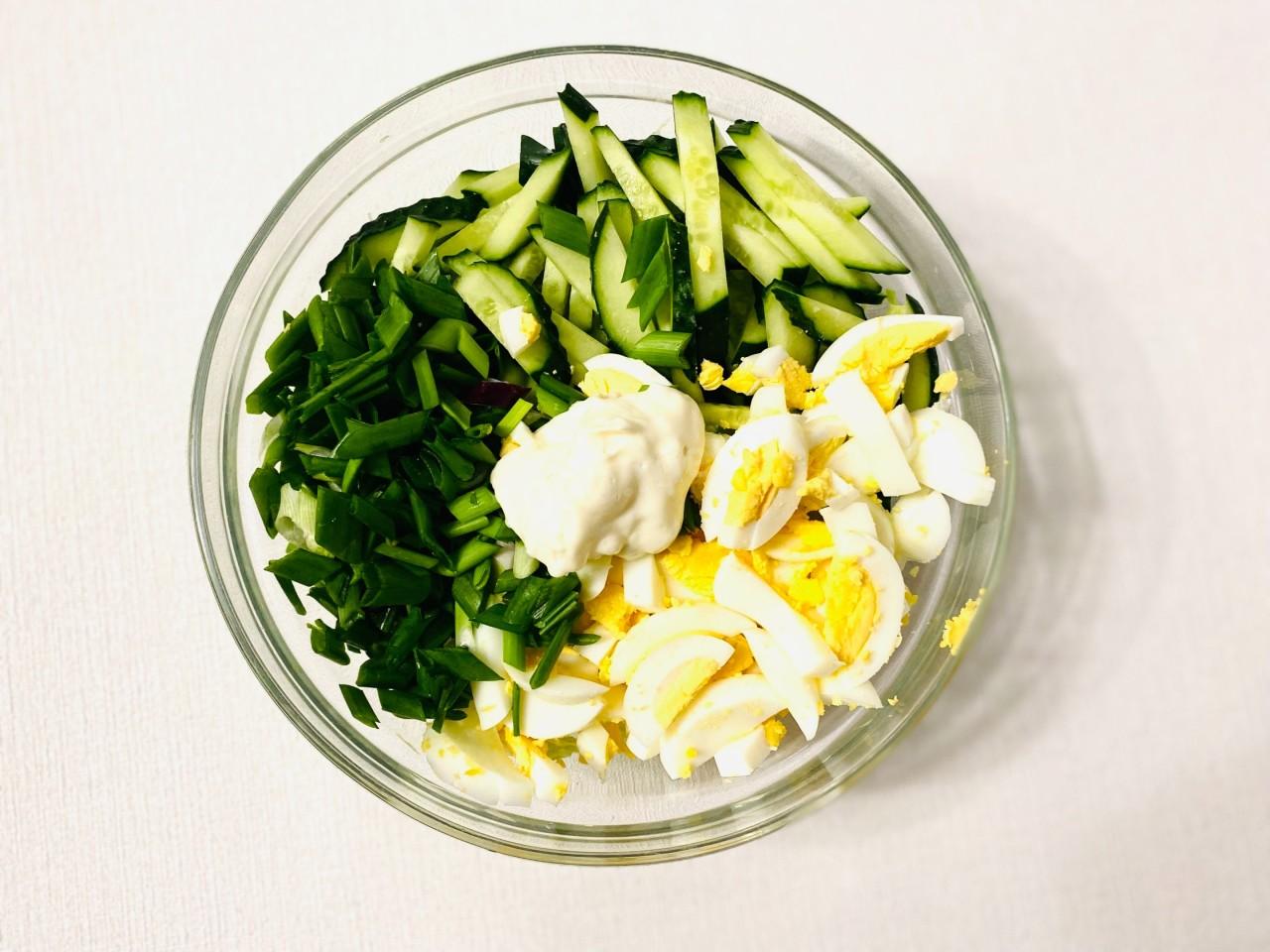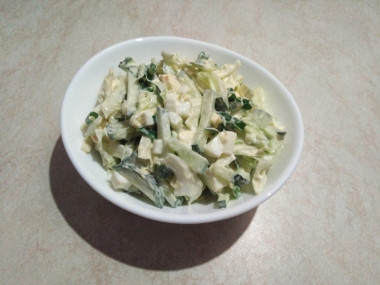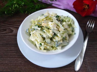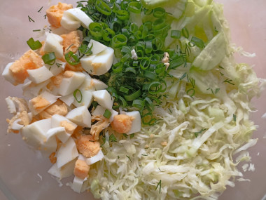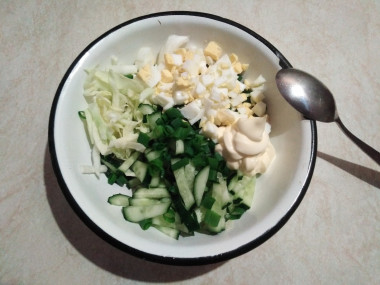 Капусту нашинковала, слегка посолила и помяла руками. Добавила порезанные огурцы и зелёный лук. Время на варку яиц не тратила,т.к. они уже были сваренные. Я их порезала мелкими кубиками. Добавила майонез и перемешала.
