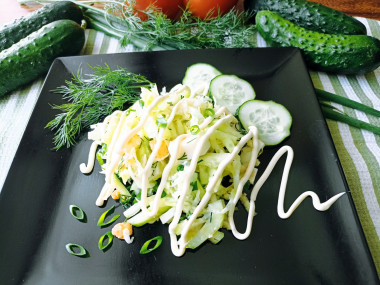 Приготовила салат из свежей капусты с майонезом. Капуста сейчас молодая, салат с ней получается особенно сочным и вкусным. Добавление свежего огурчика и зелени добавляют свежесть и аромат. Яйцо и майонез делают салат более питательным и сытным. Очень вкусно! Спасибо автору за рецепт!