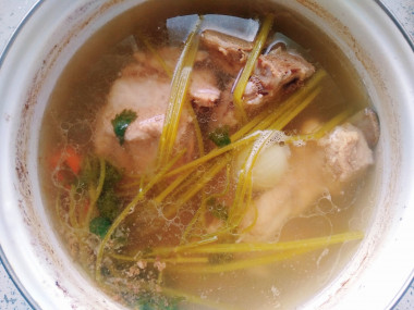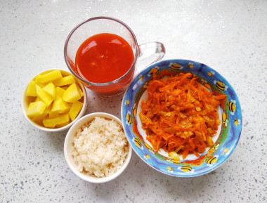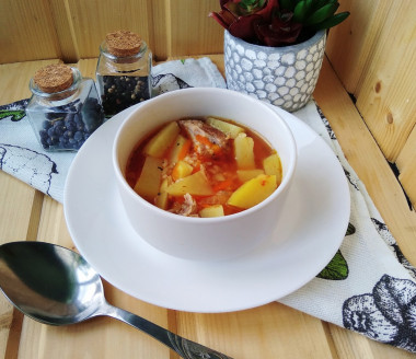 Суп я варила из свинины, только взяла не мякоть, а ребра с хорошим слоем мяса. Свинина была парная, я не люблю специфический запах, поэтому отваривала ребра с добавлением лука, моркови и веточек петрушки. Этот прием всегда мне помогает отбить подобный запах. Варила бульон около часа, потом все выложила на тарелку, мясо сняла с костей, все остальное выбросила. А бульон процедила в чистую кастрюлю, таким образом у меня получился прозрачный и вкусный бульон. далее по рецепту добавила картошку, рис и зажарку. А вот "хреновины" у меня не было. Поразмыслив, что эта заправка состоит в основном из чеснока, хрена и томата сделала ее на скорую руку. Для этого смешала домашний кетчуп с тертым чесноком, в огороде откопала кусочек хрена (хорошо хоть земля не замерзла)) и разбавила все водой немного. Отличная заправка вышла! Суп получился наваристым, сытным и в меру острым. Корень хрена и чеснок придали супчику новый необычный вкус. Больше всего понравилось мужу конечно) Спасибо за рецепт!