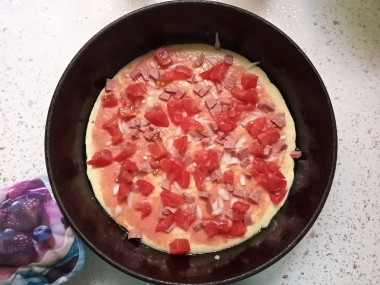 Сковороду смажьте растительным маслом. Вылейте на сковороду приготовленное тесто. Сверху аккуратно с помощью кулинарной кисти нанесите соус из кетчупа и майонеза. Основу для пиццы посыпьте кубиками колбасы, разложите на нее колечки репчатого лука и кружочки помидоров. Для оформления пиццы можно использовать и иные ингредиенты по вкусу, например, оливки или измельченные маринованные огурцы, вареные яйца и другое по вкусу.