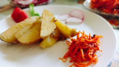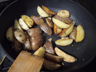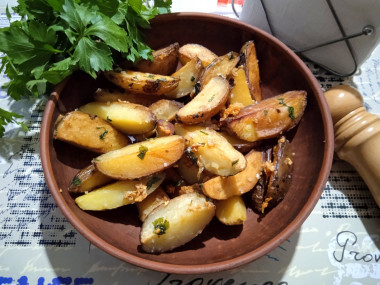Захотелось сделать картошку дольками. На любимом сайте понравился мне этот рецепт. Выбрала картошку небольших размером, помыла и нарезала дольками. Жарила на растительном и сливочном масле до румяности, на маленьком огне под крышкой, чтоб прожарилась. Готовила по описанию в рецепте. Добавила соль, чеснок, выдавленный через пресс, и мелко порезанную петрушку. Волшебный аромат был на кухне во время приготовления. Картошка дольками со шкуркой получилась мягкой внутри и нежной, с отличным дополнением в виде зелени, масла, чеснока.