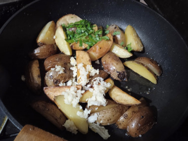 Шаг 7. Как добавить чеснок и зелень к картошке в сковороду?