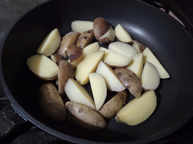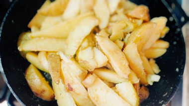 Отправьте картофель в разогретую с маслом сковороду. Огонь оставьте маленьким. Такие картофельные дольки больше, чем обычные ломтики, поэтому и готовиться они будут дольше. На среднем огне они могут подгореть. Жарьте картошку около 30 минут. Часто мешать еë не надо. Будет достаточно 4-5 раз за всë время.