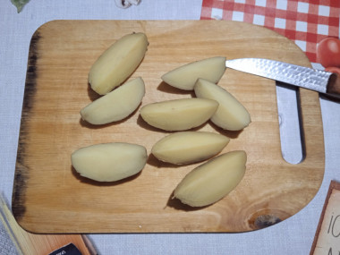 Хорошо промойте картофель, обсушите бумажным полотенцем и удалите глазки, если таковые имеются. Каждую картофелину разрежьте на восемь частей. Кожуру можно не очищать.
