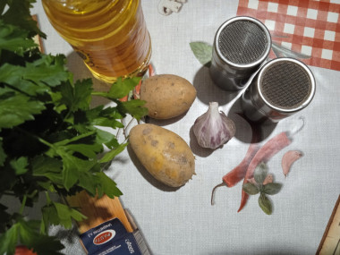 Для начала подготовьте все ингредиенты по списку. Картошку лучше брать молодую, поскольку готовиться она будет с кожурой, а также небольшого размера, чтобы она равномерно прожарилась. С выбором сорта картофеля вам поможет статья под рецептом. Чеснок разделите на зубчики, очистите от шелухи, помойте в холодной проточной воду и обсушите бумажными полотенцами. Зелень помойте и обсушите.