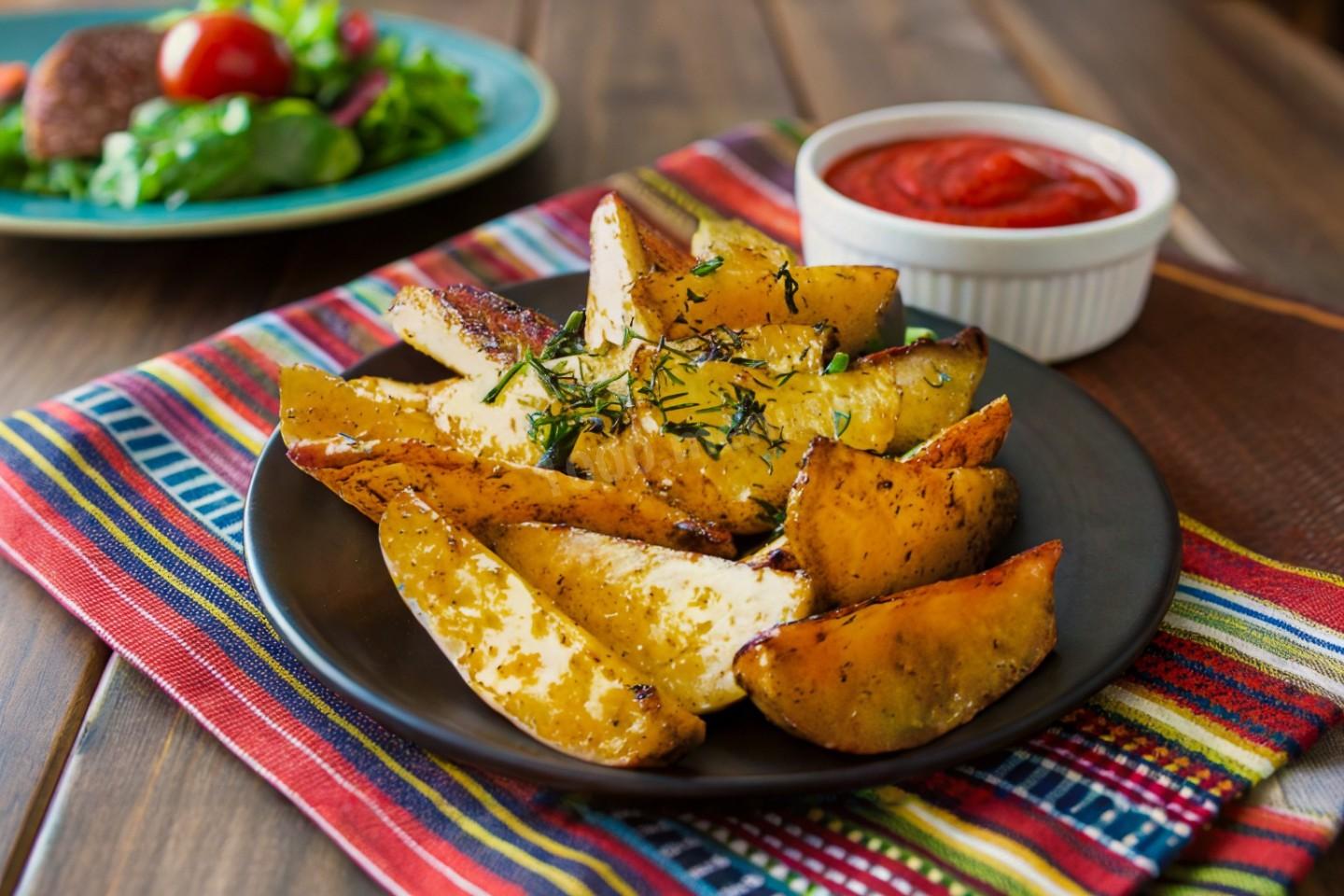 Картошка по-деревенски получилась вкусная, с приятным чесночным ароматом. Подавала еë как гарнир к запеченной баранине.