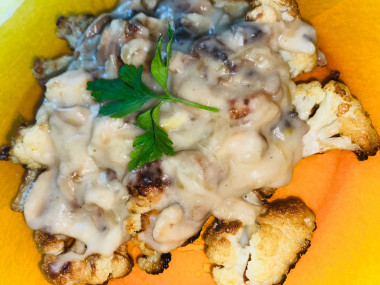 Достаем из духовки запеченные стейки из цветной капусты, равномерно выкладываем на тарелке, поливаем соусом с грибами и сливками, присыпаем мелко рубленой петрушкой или другой зеленью по сезону. Посыпаем для красоты специями (по желанию).