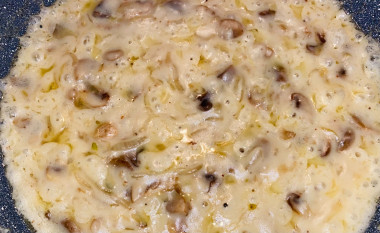 Нарезаем лук полосками или мелким кубиком, разогреваем в сковороде оставшееся сливочное масло. Обжариваем лук в течение 5 минут, постоянно помешивая, пока он не станет легким и слегка карамелизированным. Добавляем грибы, прожариваем вместе с луком еще 5 минут. Присыпаем овощи мукой и, помешивая, обжариваем еще 1 минуту.