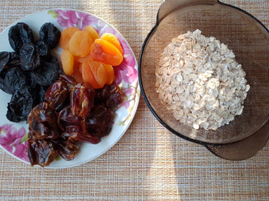 Из сухофруктов взяла чернослив курагу и финики ( от них основная сладость). Изюм у меня был, но решила его не добавлять.