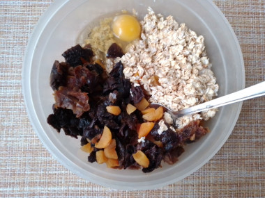 Соединила сухофрукты с овсяными хлопьями и яйцом. Добавила немного молотой корицы и все хорошо перемешала. Получилась масса средней густоты: не жидкое, но и не плотное.