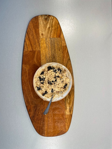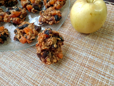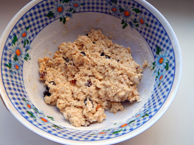Геркулес с сухофруктами залила кипятком в одной миске, чтоб вишня отдала часть своей сладости крупе и печенье было сладкое равномерно, а не только в тех местах, где есть сухофрукты. После чего излишки воды слила и немного "выжала" крупу с помощью марли.