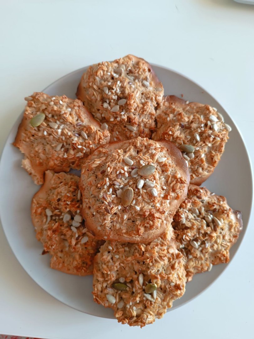 Добрый день! Благодарю за рецепт. Внесла некоторые изменения исходя из наличия продуктов. Вначале замочила овсяные хлопья, как предложено у Вас. В это время отдельно смешала ст.ложку меда, соль, разрыхлитель, ваниль, растительное масло. Затем добавила эту смесь к хлопьям. Будьте готовы к тому, что вся жидкая смесь не впитается в хлопья!!! Раскладывала столовой ложкой на силиконизированный пергамент. Сверху посыпала салатной смесью из семян подсолнечника, тыквы, кунжута. Результат меня лично удовлетворил.